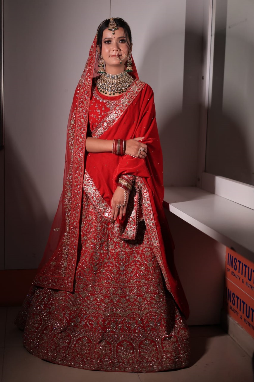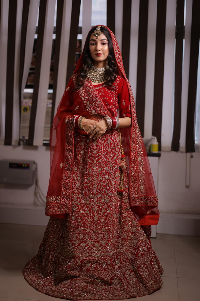 Step into timeless royalty with this handcrafted red bridal lehenga, adorned with intricate zari, sequin and thread embroidery all over. The rich traditional work, paired with a matching dupatta and exquisite detailing, makes it the perfect choice for brides who want a classic yet luxurious wedding look. Styled with heavy bridal jewellery, this outfit offers the true essence of an Indian "Maharani" bride. Ideal for weddings, receptions, and premium bridal photoshoots.