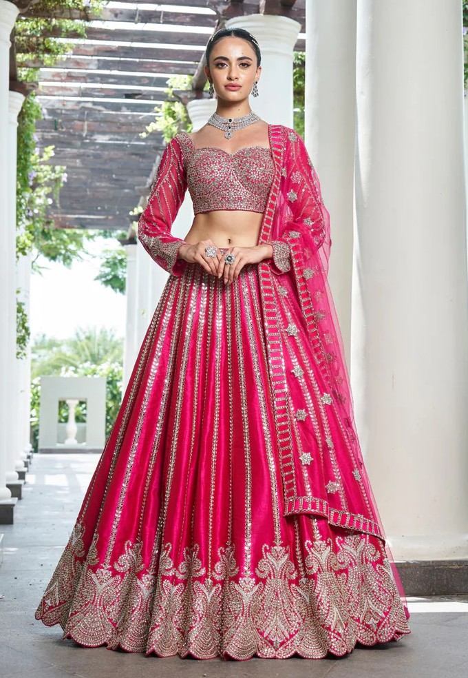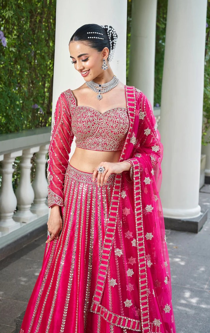 This lehenga set is crafted on silk fabric and features all over embroidery highlighted with mirrors and moti work, giving the outfit a detailed and rich appearance without being overwhelming. The full sleeves blouse adds a balanced and elegant structure, making it suitable for traditional celebrations and festive events. The set is paired with a net dupatta that has a coordinated finish, completing the outfit in a clean and refined way.