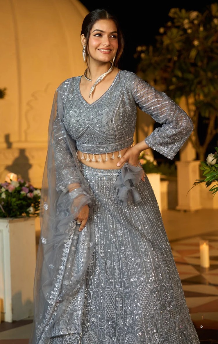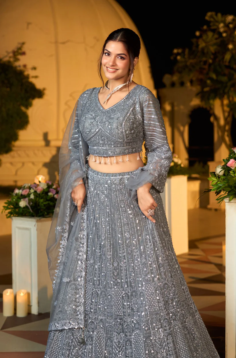 This lehenga set is designed on net fabric and features overall multi-sequence work combined with bead detailing, giving the outfit a well-finished and structured look. The embroidery adds depth and pattern throughout the garment, making it suitable for festive events and special occasions. The set includes a matching blouse and a net dupatta that complements the design, keeping the overall appearance balanced and coordinated.