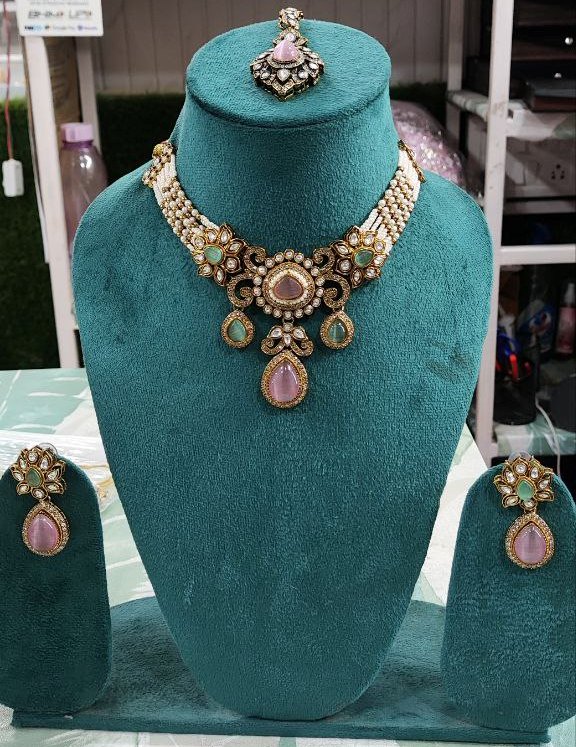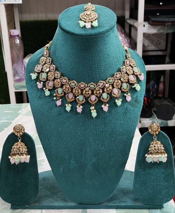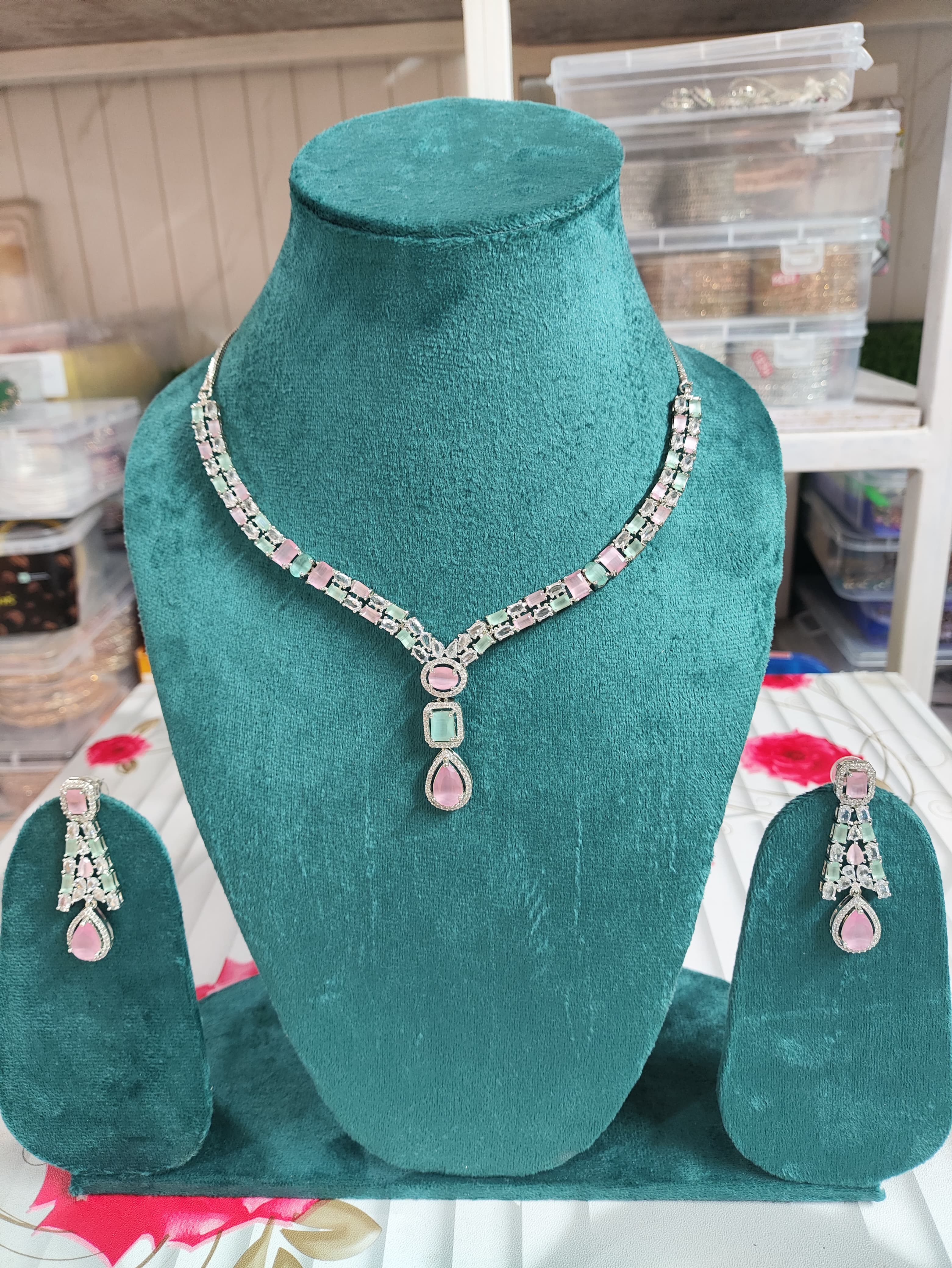 Pastel Pink - Green Bloom Diamond-Finish Jewellery Set